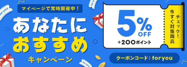![]() 5%OFF | foryou | 常時 | マイページにて確認 | 対象商品5%OFF+200PT | – |