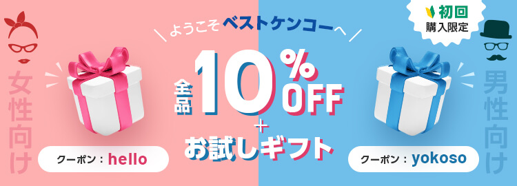 ![]() 10%OFF+おまけ | 男性用:yokoso 女性用:hello | 常時 | 割引商品を除く全商品 | 購入時10%OFF+おまけ付クーポン配布 | 初回購入時限定 |