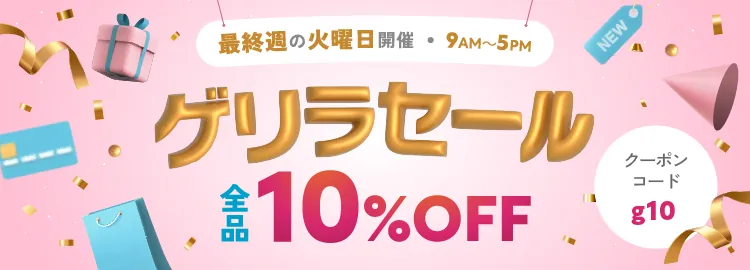 ![]() 10%OFF | g10 | 最終週火曜日の 9〜17時 | 割引商品を除く全商品 | 購入時10%OFF | – |