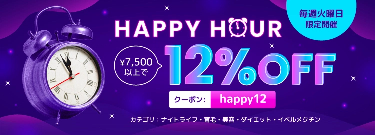 ![]() 12%OFF | happy12 | 毎週火曜限定 | 対象の5カテゴリー | ¥7,500円以上:12%OFF | – |