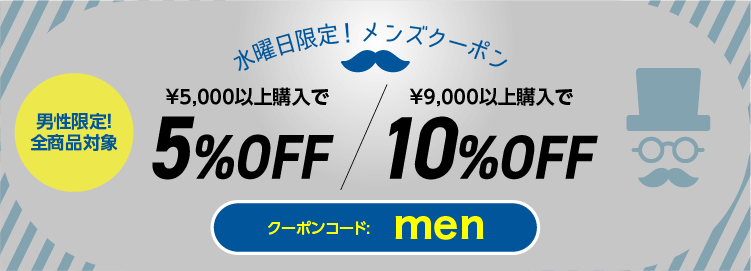![]() 最大10%OFF | men | 毎週水曜限定 | 割引商品を除く全商品 | ¥5,000以上:5%OFF ¥9,000以上:10%OFF | 男性会員のみ利用可能 |