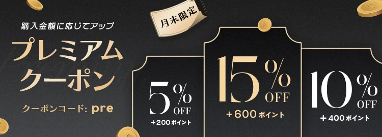 ![]() 最大15%OFF | pre | 毎月末の金・土・日限定 | 割引商品を除く全商品 | ¥6,000以上 10%OFF+200PT ¥12,000以上 15%OFF+400PT ¥24,000以上 15%OFF+600PT | – |