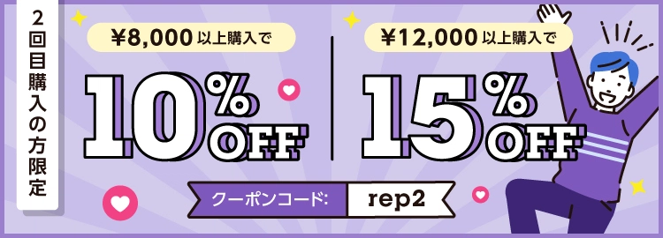 ![]() 最大15%OFF | rep2 | 常時 | 全商品 | ・¥8,000以上:10%OFF ・¥12,000以上:15%OFF | 2回目購入の方限定 |