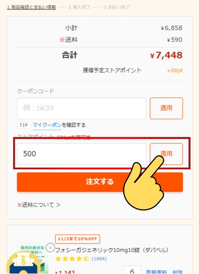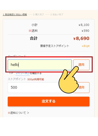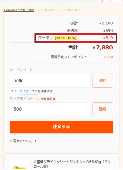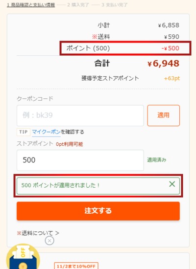 割引額がすぐに反映されるため、購入額から割引されているか確認をして注文を確定させてください。
