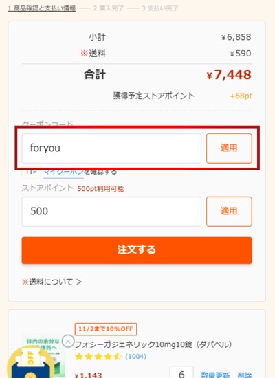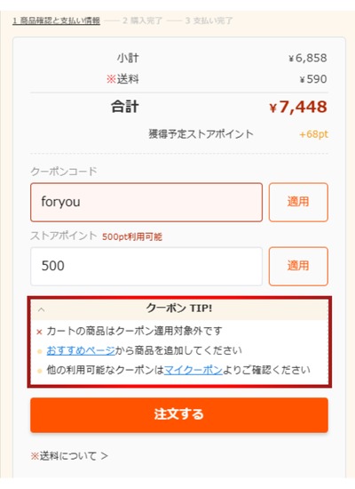 割引額がすぐに反映されるため、購入額から割引されているか確認をして注文を確定させてください。