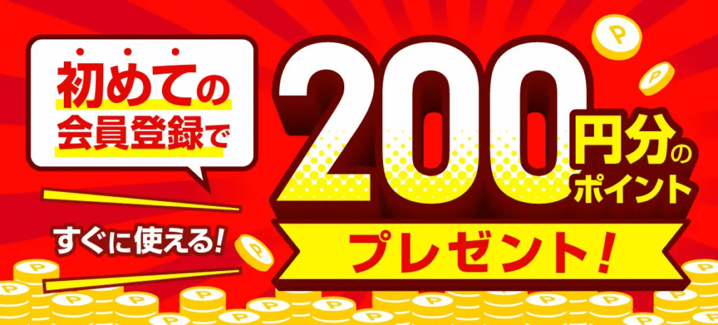 ![]() ![]() 200PT獲得 | – | 常時 2024年3月20日(水)~ | – | 新規会員登録で200PT獲得 | 新規登録した方 |